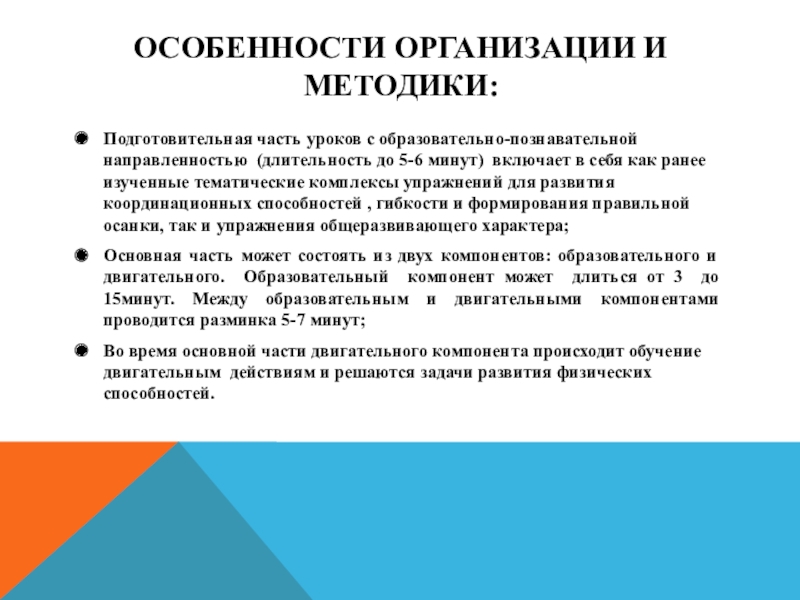 Основная часть может состоять из двух компонентов: образовательного и двигательного. Образовательный компонент может длиться от 3 до 15минут. Между образовательным и двигательными компонентами проводится разминка 5-7 минут;
