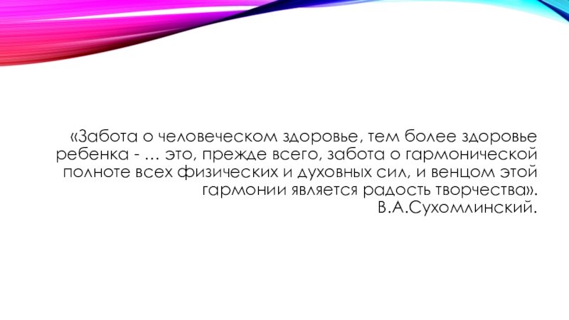 «Забота о человеческом здоровье, тем более здоровье ребенка - … это, прежде всего, забота о гармонической полноте всех физических и духовных сил, и венцом этой гармонии является радость творчества».