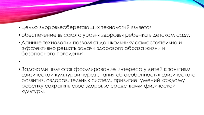 Целью здоровьесберегающих технологий являетсяобеспечение высокого уровня здоровья ребенка в детском саду. Данные технологии позволяют дошкольнику самостоятельно и эффективно