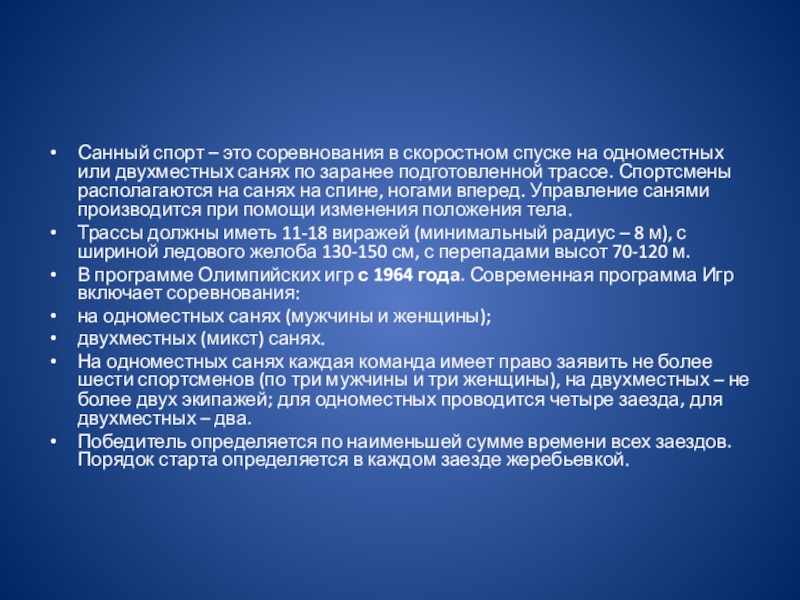 Слайд 21Санный спорт – это соревнования в скоростном спуске на одноместных или