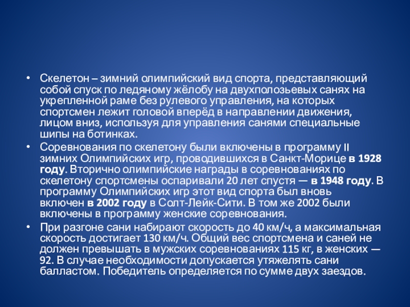 Слайд 23Скелетон – зимний олимпийский вид спорта, представляющий собой спуск по ледяному