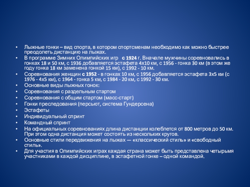 Слайд 17Лыжные гонки – вид спорта, в котором спортсменам необходимо как можно