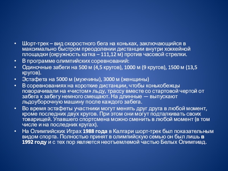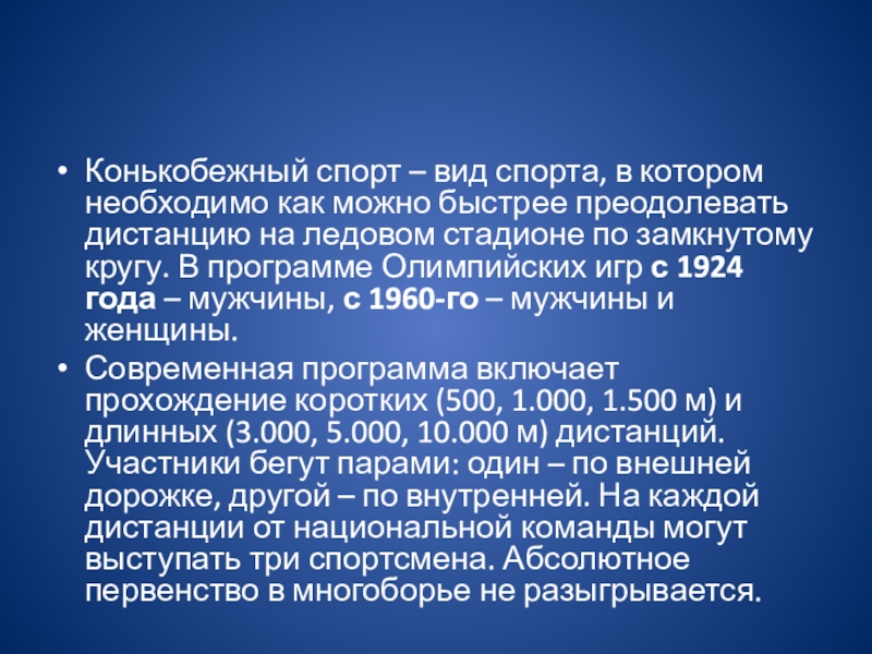 преодолевать дистанцию на ледовом стадионе по замкнутому кругу. В программе Олимпийских игр с 1924 года – мужчины, с 1960-го – мужчины и женщины.