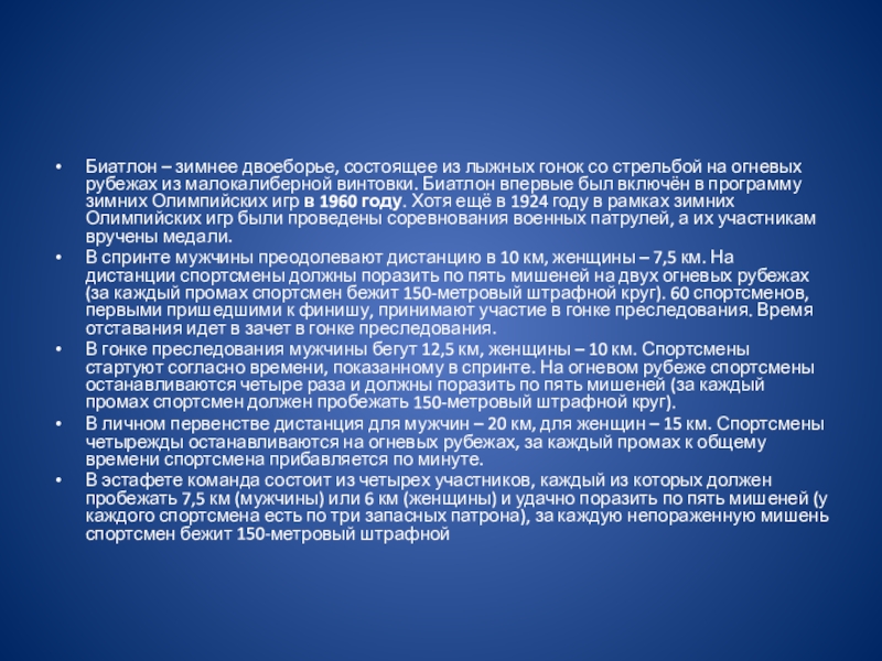 огневых рубежах из малокалиберной винтовки. Биатлон впервые был включён в программу зимних Олимпийских игр в 1960 году. Хотя ещё в 1924 году в рамках зимних Олимпийских игр были проведены соревнования военных патрулей, а их участникам вручены медали.
