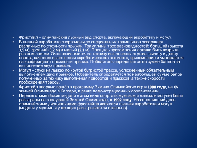 Слайд 29Фристайл – олимпийский лыжный вид спорта, включающий акробатику и могул.