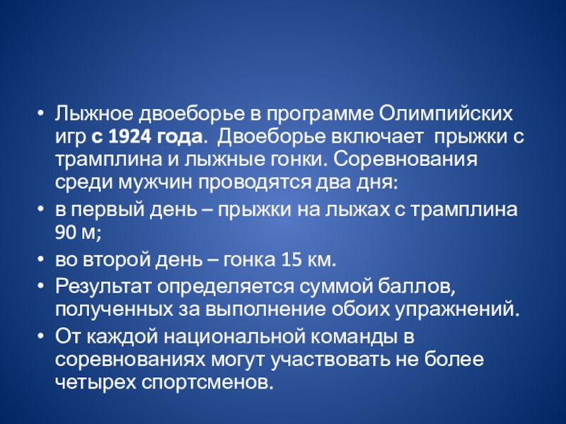Слайд 15Лыжное двоеборье в программе Олимпийских игр с 1924 года. Двоеборье включает прыжки