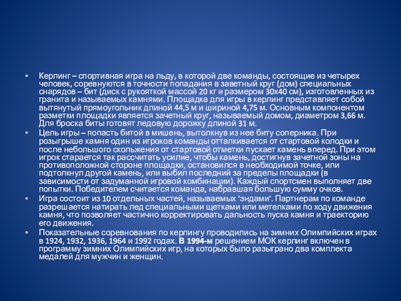 Слайд 11Керлинг – спортивная игра на льду, в которой две команды, состоящие