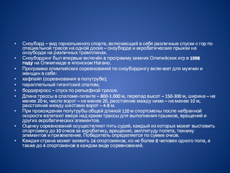 гор по специальной трассе на одной доске – сноуборде и акробатические прыжки на сноуборде на различных трамплинах.