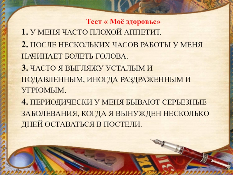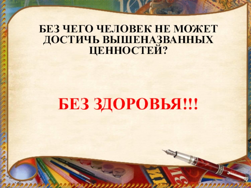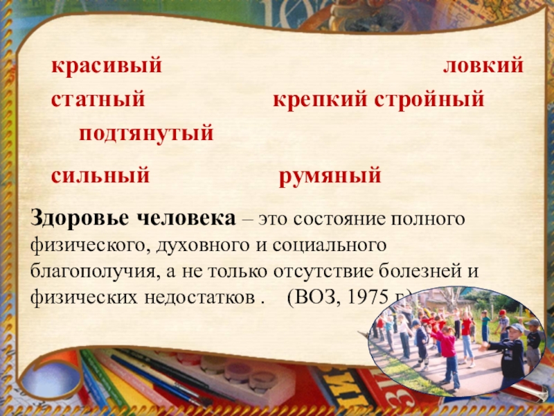 Здоровье человека – это состояние полного физического, духовного и социального благополучия, а не только отсутствие болезней и физических недостатков . (ВОЗ, 1975 г.)