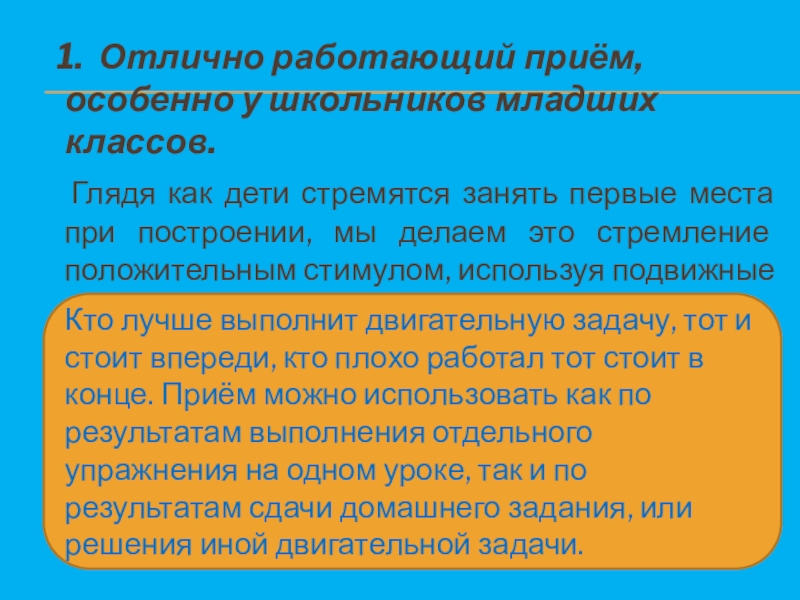 Кто лучше выполнит двигательную задачу, тот и стоит впереди, кто плохо работал тот стоит в конце. Приём можно использовать как по результатам выполнения отдельного упражнения на одном уроке, так и по результатам сдачи домашнего задания, или решения иной двигательной задачи.
