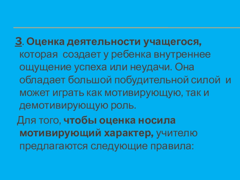 Для того, чтобы оценка носила мотивирующий характер, учителю предлагаются следующие правила: