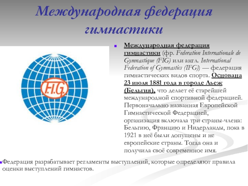 Федерация разрабатывает регламенты выступлений, которые определяют правила оценки выступлений гимнастов.