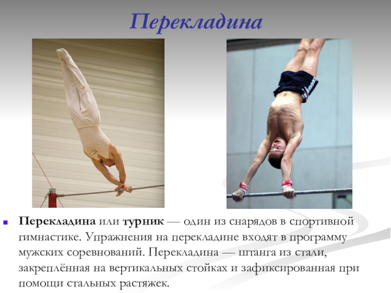 В современной программе гимнастического многоборья: для женщин — на брусьях разной высоты, бревне, в опорных прыжках, вольных упражнениях; для мужчин — в вольных упражнениях, опорных прыжках, на коне, кольцах, параллельных брусьях и перекладине.