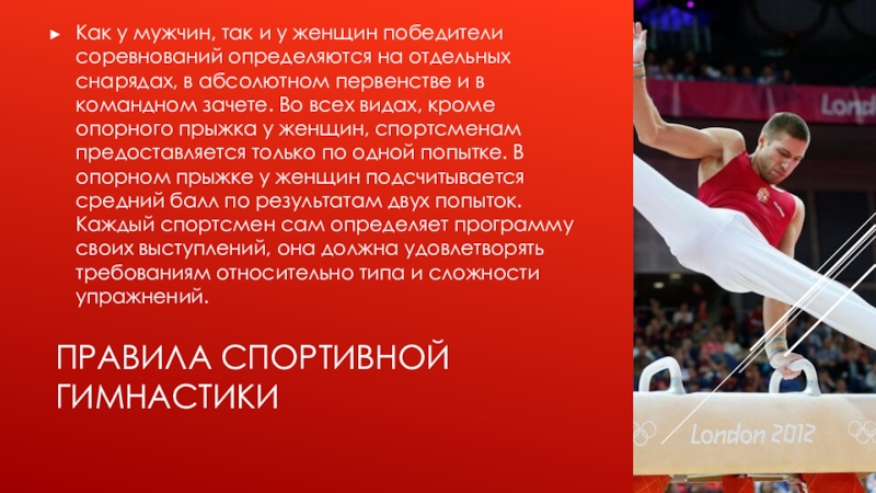 Правила спортивной гимнастикиКак у мужчин, так и у женщин победители соревнований определяются на отдельных снарядах, в абсолютном