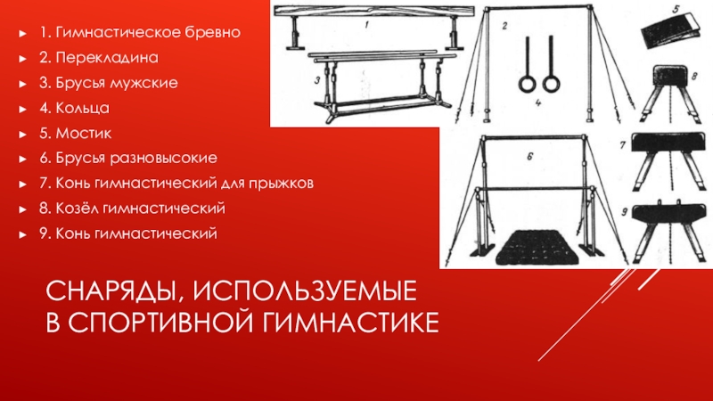 СНАРЯДЫ, ИСПОЛЬЗУЕМЫЕ В СПОРТИВНОЙ ГИМНАСТИКЕ1. Гимнастическое бревно2. Перекладина3. Брусья мужские4. Кольца5. Мостик6. Брусья разновысокие7. Конь гимнастический для прыжков8.