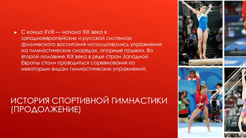 Слайд 5История СПОРТИВНОЙ ГИМНАСТИКИ  (продолжение)