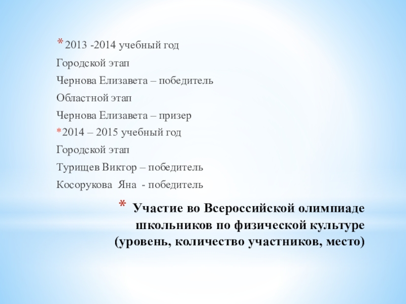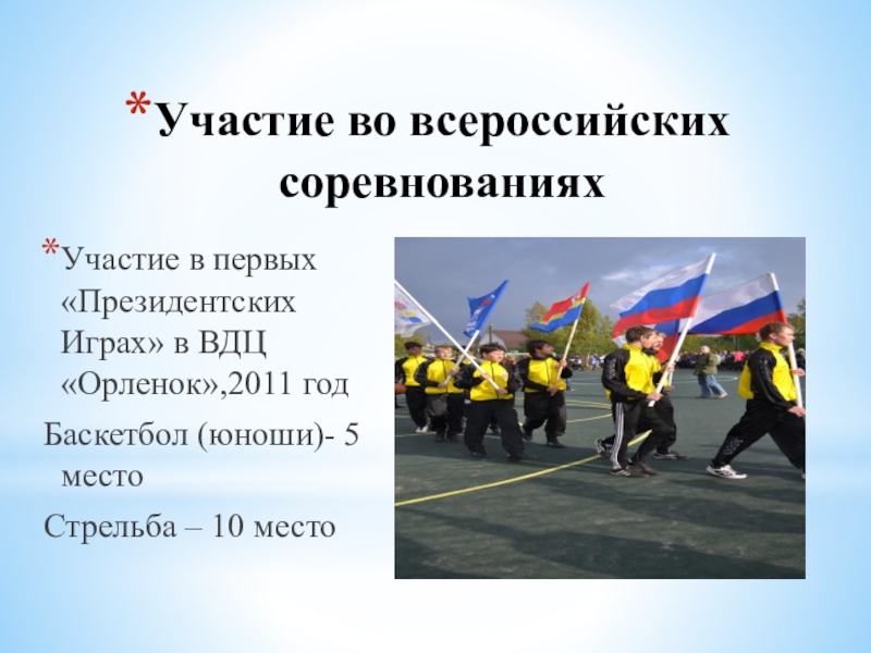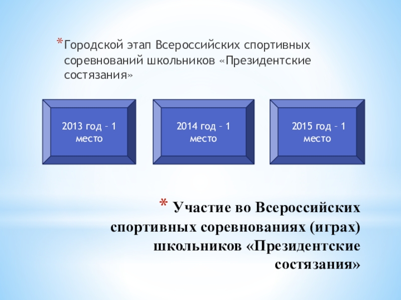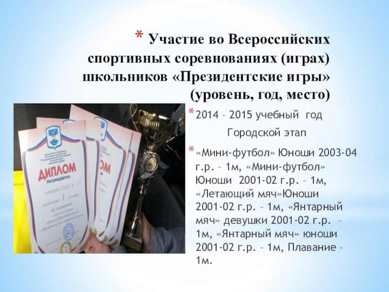 «Мини-футбол» Юноши 2003-04 г.р. – 1м, «Мини-футбол» Юноши 2001-02 г.р. – 1м, «Летающий мяч»Юноши 2001-02 г.р. – 1м, «Янтарный мяч» девушки 2001-02 г.р. – 1м, «Янтарный мяч» юноши 2001-02 г.р. – 1м, Плавание – 1м.