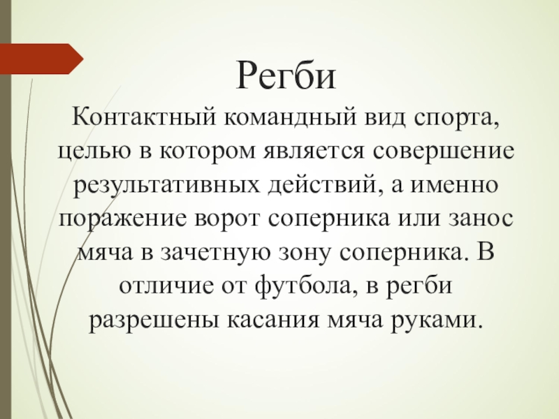 а именно поражение ворот соперника или занос мяча в зачетную зону соперника. В отличие от футбола, в регби разрешены касания мяча руками.
