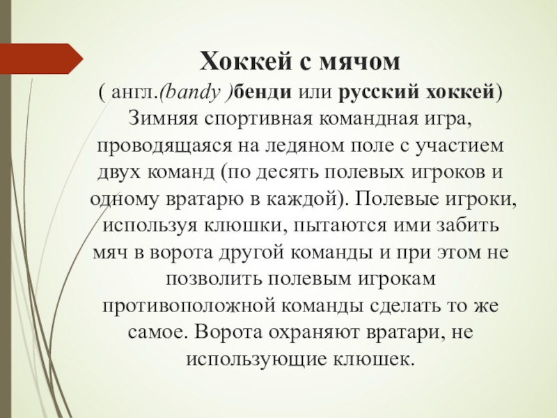 на ледяном поле с участием двух команд (по десять полевых игроков и одному вратарю в каждой). Полевые игроки, используя клюшки, пытаются ими забить мяч в ворота другой команды и при этом не позволить полевым игрокам противоположной команды сделать то же самое. Ворота охраняют вратари, не использующие клюшек.