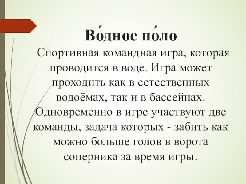проходить как в естественных водоёмах, так и в бассейнах. Одновременно в игре участвуют две команды, задача которых - забить как можно больше голов в ворота соперника за время игры.