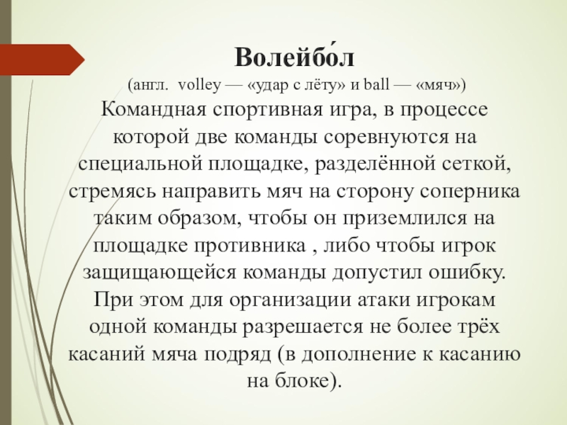 процессе которой две команды соревнуются на специальной площадке, разделённой сеткой, стремясь направить мяч на сторону соперника таким образом, чтобы он приземлился на площадке противника , либо чтобы игрок защищающейся команды допустил ошибку. При этом для организации атаки игрокам одной команды разрешается не более трёх касаний мяча подряд (в дополнение к касанию на блоке).