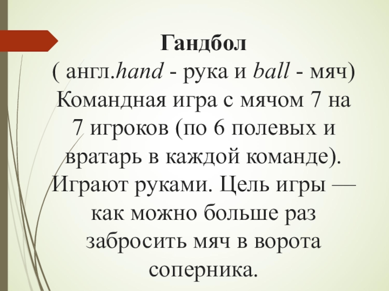 6 полевых и вратарь в каждой команде). Играют руками. Цель игры — как можно больше раз забросить мяч в ворота
