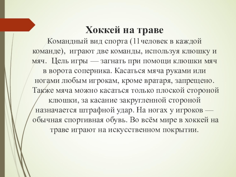 команды, используя клюшку и мяч. Цель игры — загнать при помощи клюшки мяч в ворота соперника. Касаться мяча руками или ногами любым игрокам, кроме вратаря, запрещено. Также мяча можно касаться только плоской стороной клюшки, за касание закругленной стороной назначается штрафной удар. На ногах у игроков — обычная спортивная обувь. Во всём мире в хоккей на траве играют на искусственном покрытии.