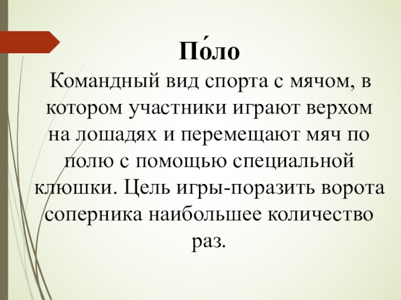 Командный вид спорта с мячом, в котором участники играют верхом на лошадях и перемещают мяч по полю с помощью специальной