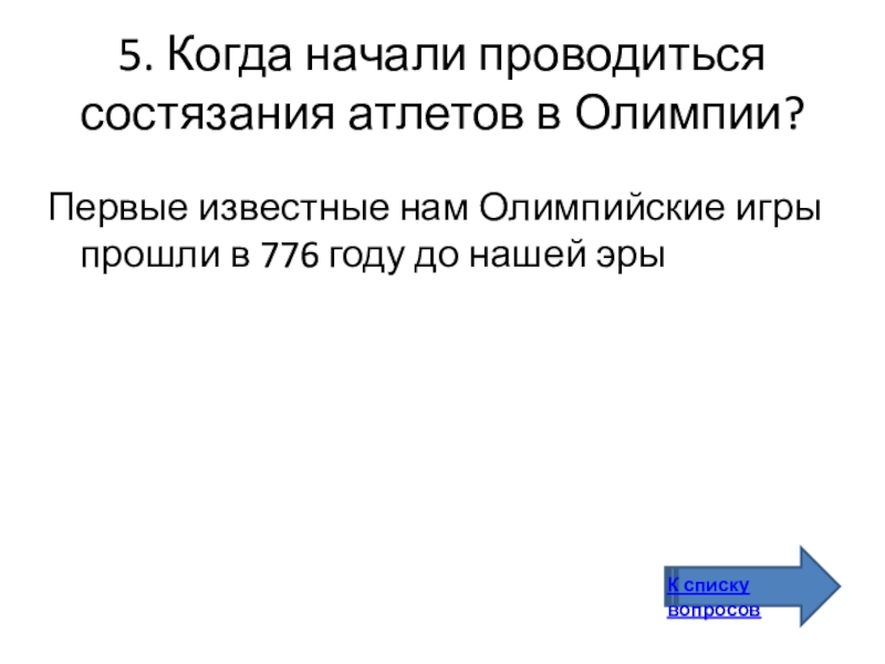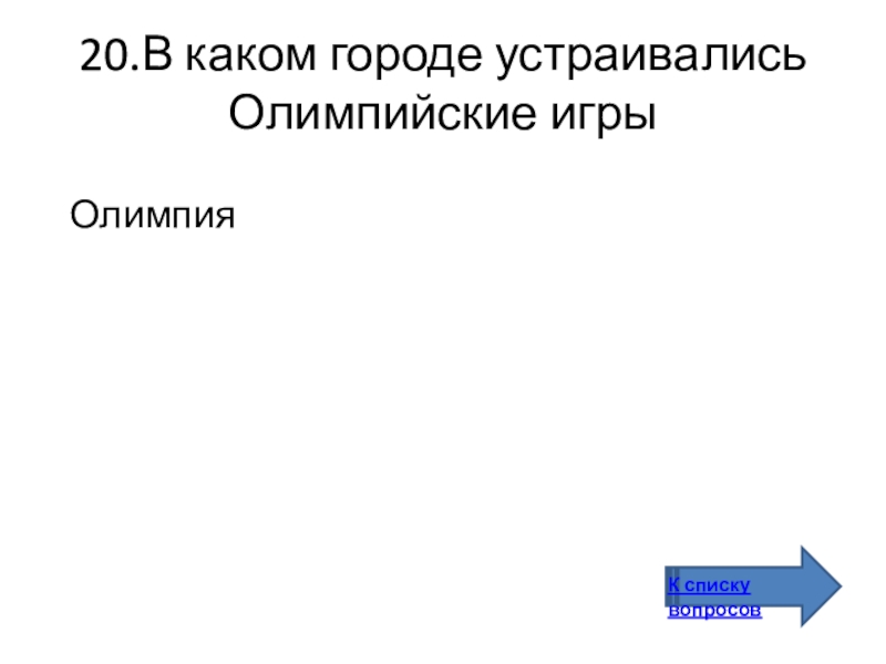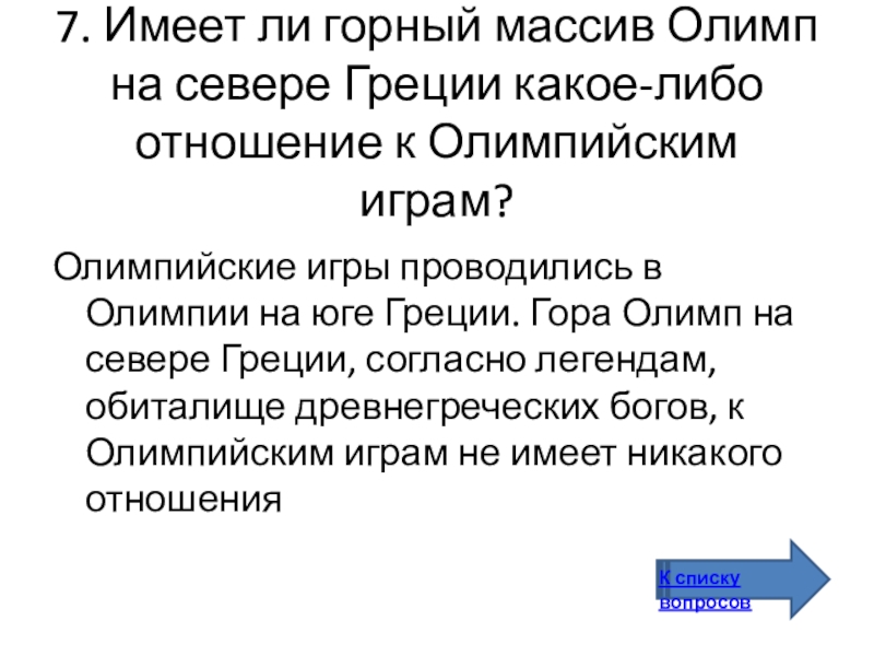Олимпийские игры проводились в Олимпии на юге Греции. Гора Олимп на севере Греции, согласно легендам, обиталище древнегреческих богов, к Олимпийским играм не имеет никакого отношения