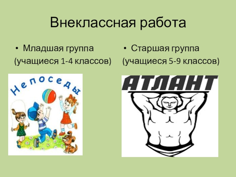 Внеклассная работаМладшая группа(учащиеся 1-4 классов)Старшая группа(учащиеся 5-9 классов)
