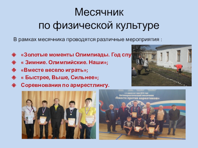 Месячник  по физической культуреВ рамках месячника проводятся различные мероприятия :«Золотые моменты Олимпиады. Год спустя»;« Зимние. Олимпийские.