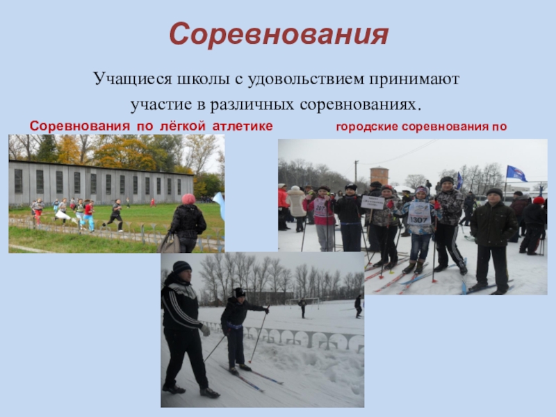 Соревнования Учащиеся школы с удовольствием принимают участие в различных соревнованиях.Соревнования по лёгкой атлетике