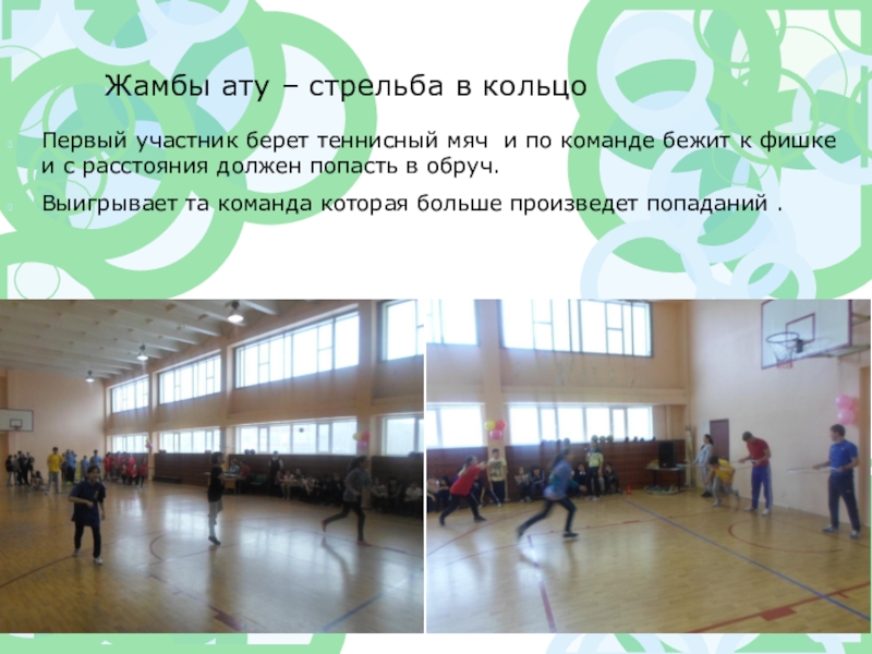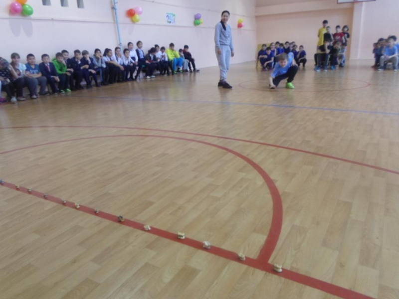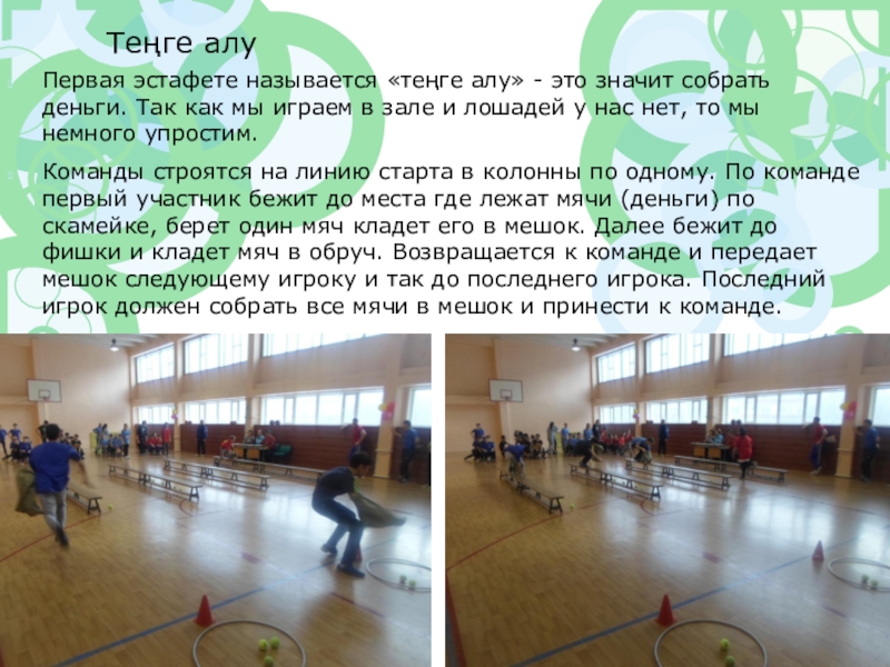 Первая эстафете называется «теңге алу» - это значит собрать деньги.