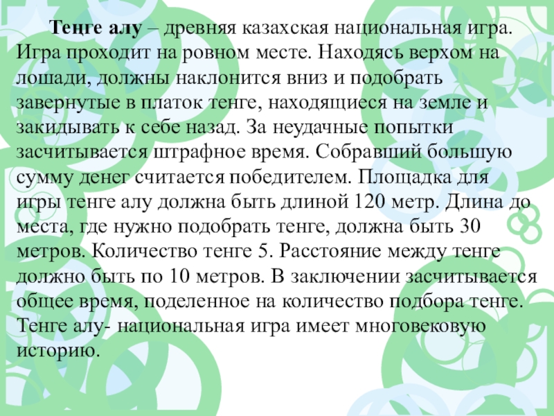 Слайд 17 Теңге алу – древняя казахская национальная игра. Игра