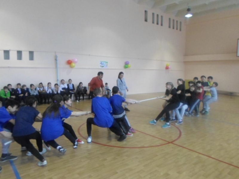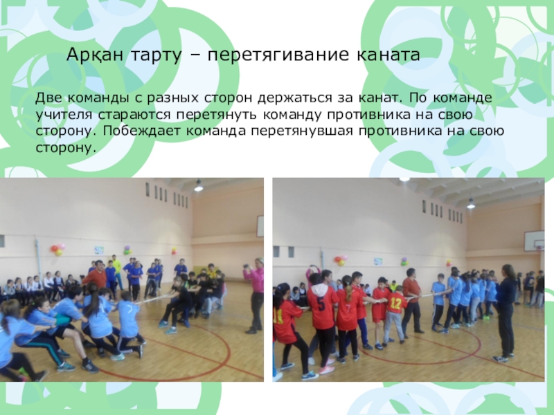 канат. По команде учителя стараются перетянуть команду противника на свою сторону. Побеждает команда перетянувшая противника на свою сторону.