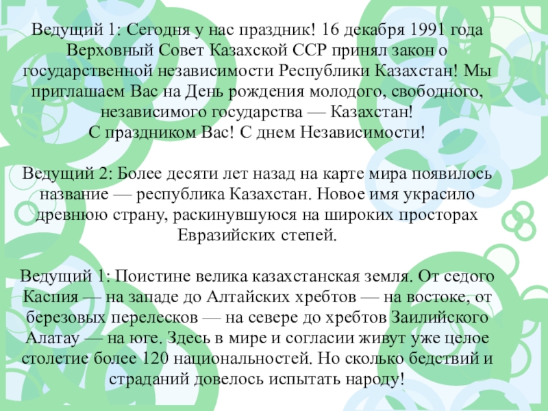Ведущий 1: Поистине велика казахстанская земля. От седого Каспия — на западе до Алтайских хребтов — на востоке, от березовых перелесков — на севере до хребтов Заилийского Алатау — на юге. Здесь в мире и согласии живут уже целое столетие более 120 национальностей. Но сколько бедствий и страданий довелось испытать народу!