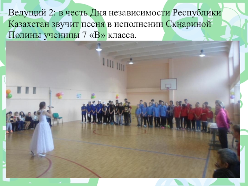 Слайд 7Ведущий 2: в честь Дня независимости Республики Казахстан звучит песня в