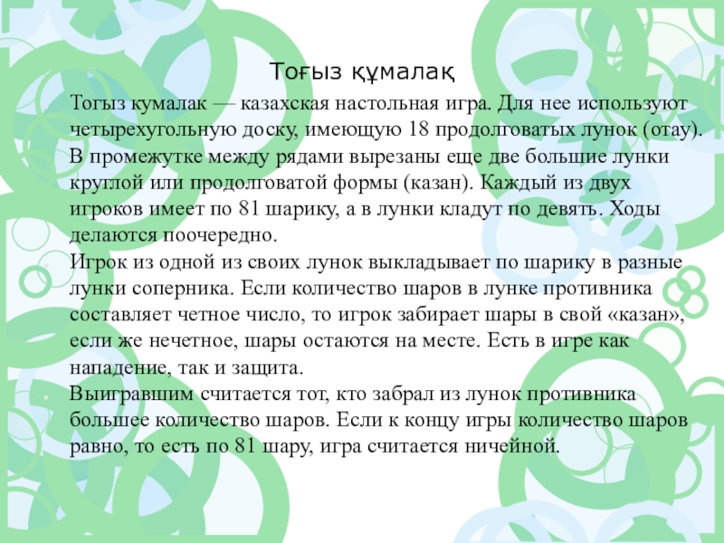Тогыз кумалак — казахская настольная игра. Для нее используют четырехугольную