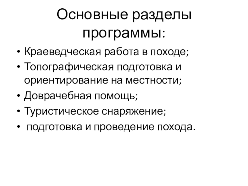 Основные разделы программы:Краеведческая работа в походе;Топографическая подготовка и ориентирование на местности;Доврачебная помощь;Туристическое снаряжение; подготовка и проведение похода.