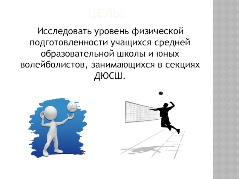 Цель:  Исследовать уровень физической подготовленности учащихся средней образовательной школы и юных волейболистов, занимающихся в секциях ДЮСШ.