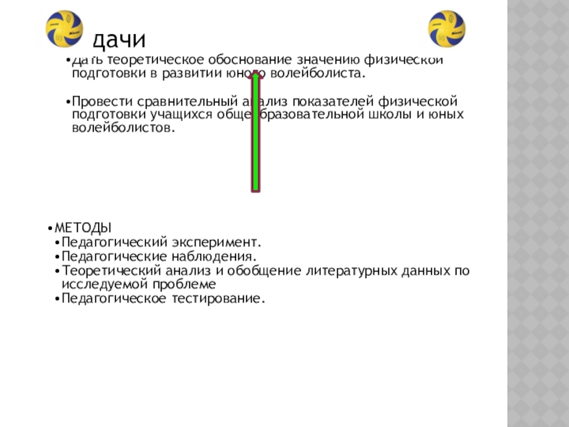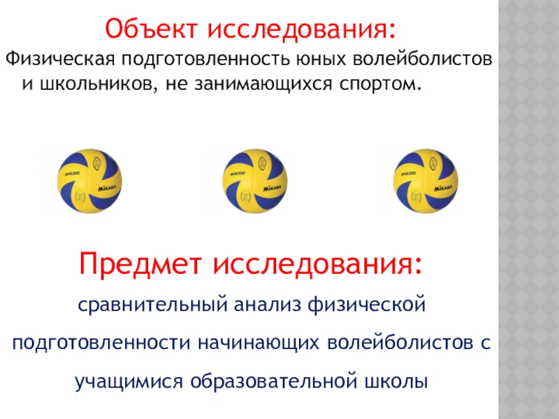 Физическая подготовленность юных волейболистов и школьников, не занимающихся спортом.Предмет исследования:Объект исследования:сравнительный анализ физической подготовленности начинающих волейболистов с