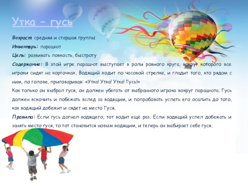 В этой игре парашют выступает в роли ровного круга, вокруг которого все игроки сидят на корточках. Водящий ходит по часовой стрелке, и гладит того, кто рядом с ним, по голове, приговаривая: «Утка! Утка! Утка! Гусь!»
