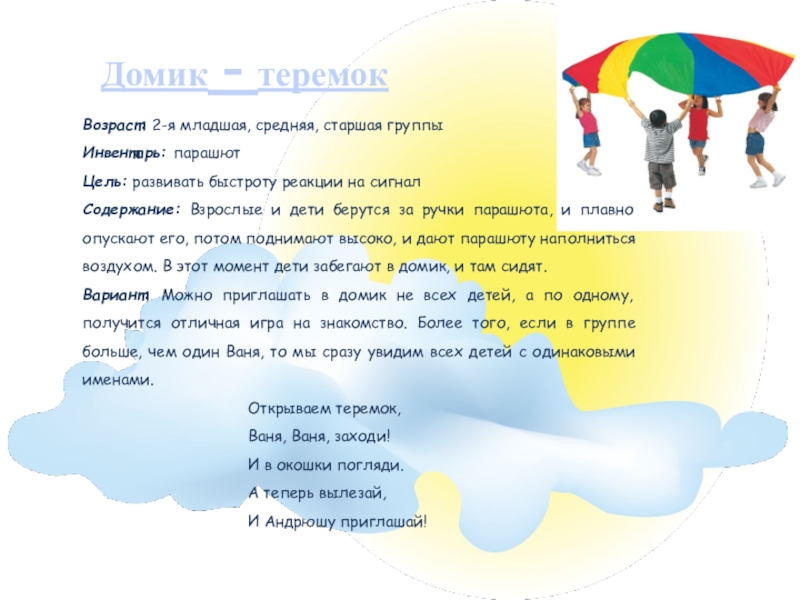 Содержание: Взрослые и дети берутся за ручки парашюта, и плавно опускают его, потом поднимают высоко, и дают парашюту наполниться воздухом. В этот момент дети забегают в домик, и там сидят.