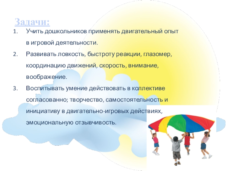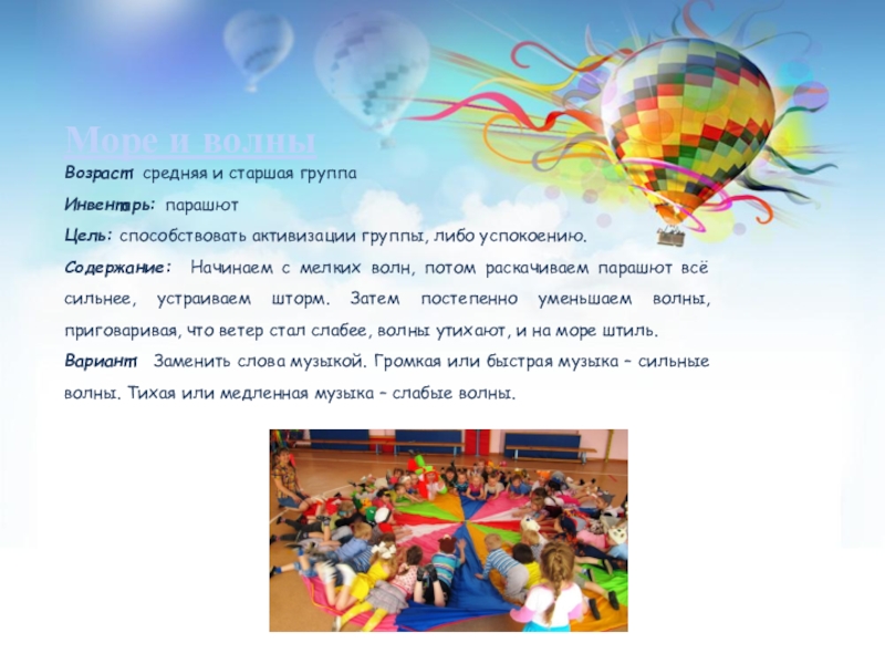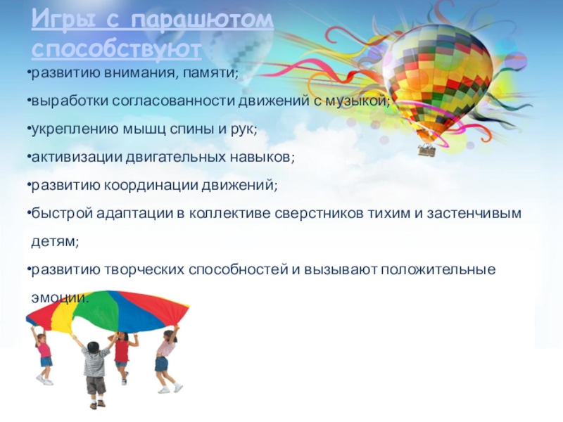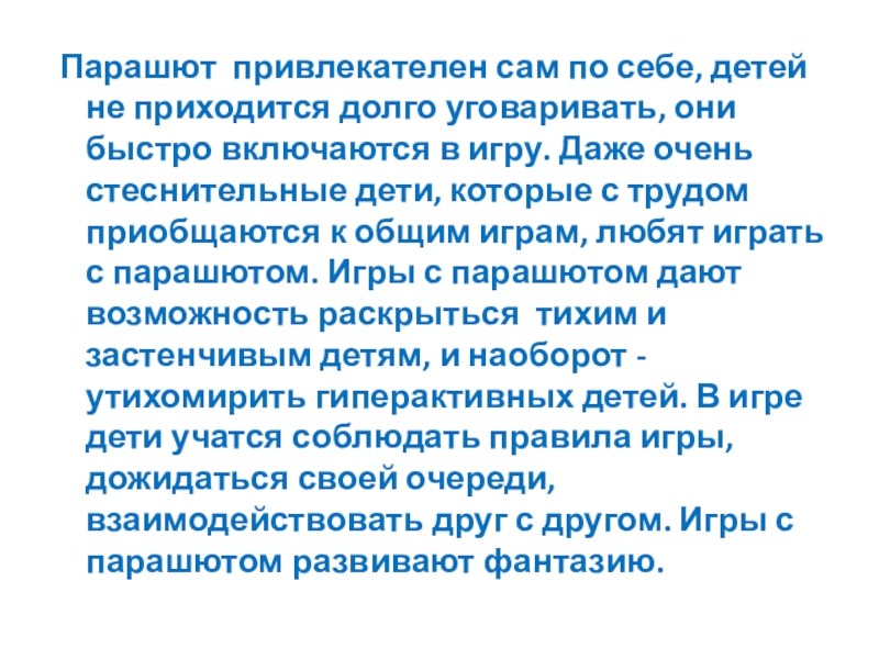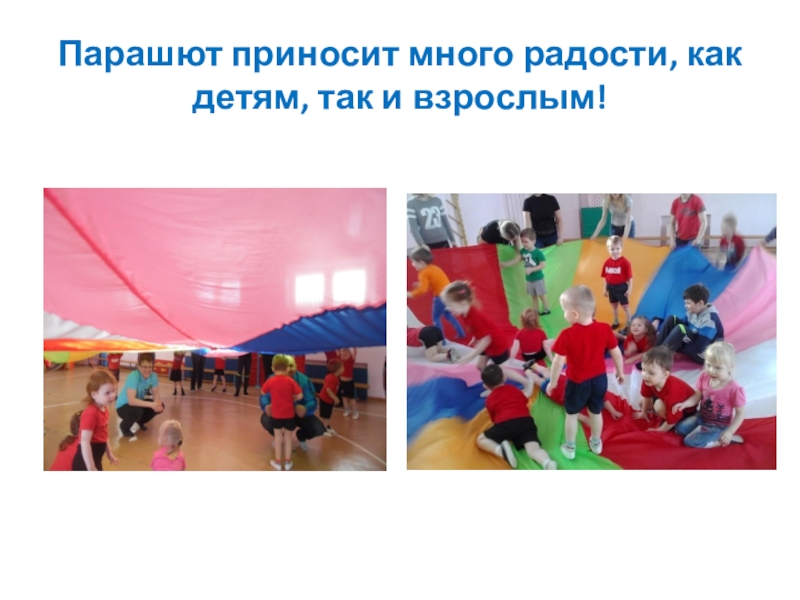 Слайд 13 Парашют привлекателен сам по себе, детей не приходится долго уговаривать,