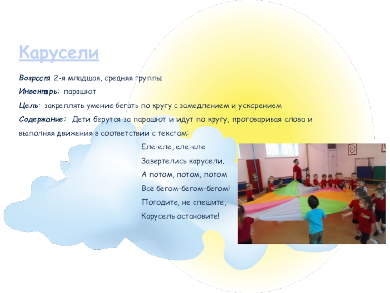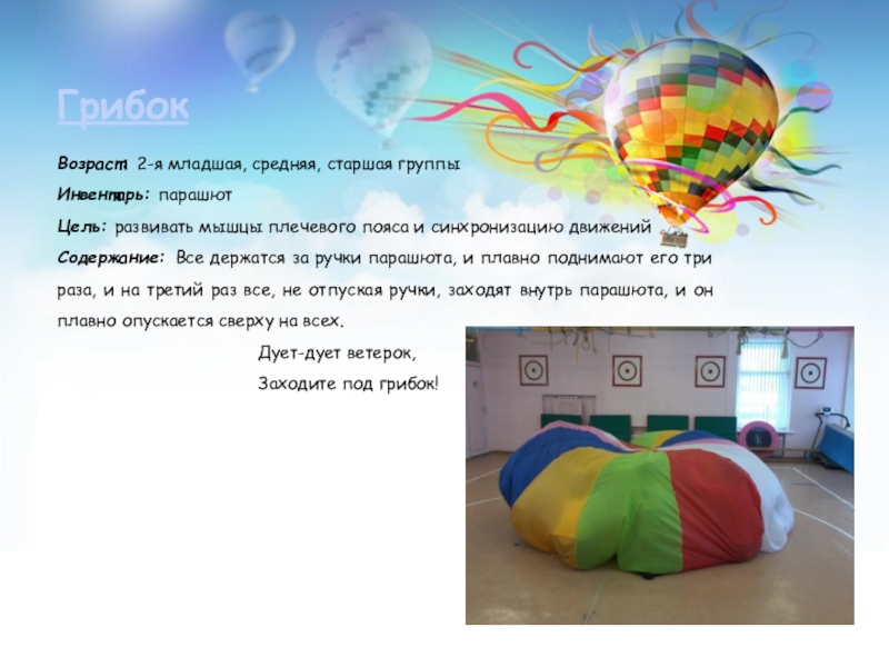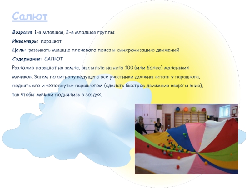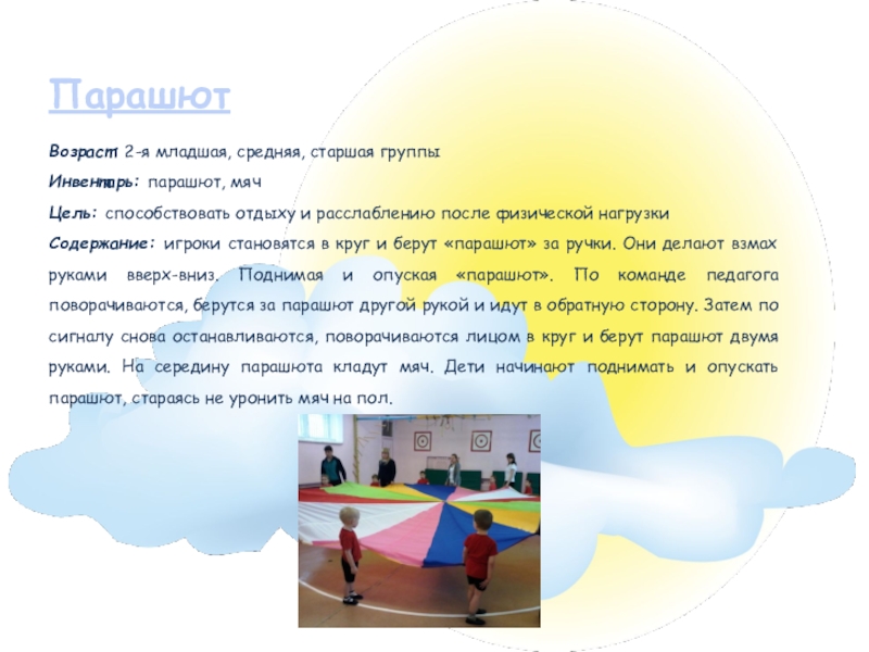 Инвентарь: парашют, лёгкий мяч среднего размера
