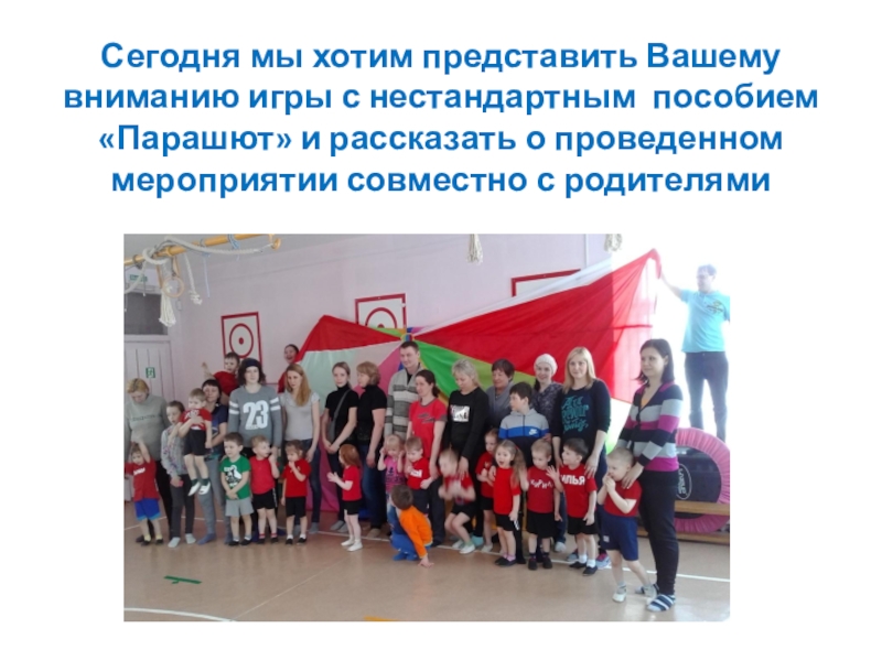 Слайд 8Сегодня мы хотим представить Вашему вниманию игры с нестандартным пособием «Парашют»