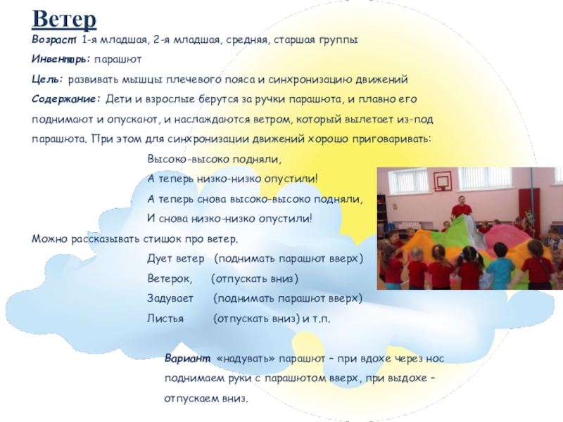 Содержание: Дети и взрослые берутся за ручки парашюта, и плавно его поднимают и опускают, и наслаждаются ветром, который вылетает из-под парашюта. При этом для синхронизации движений хорошо приговаривать: