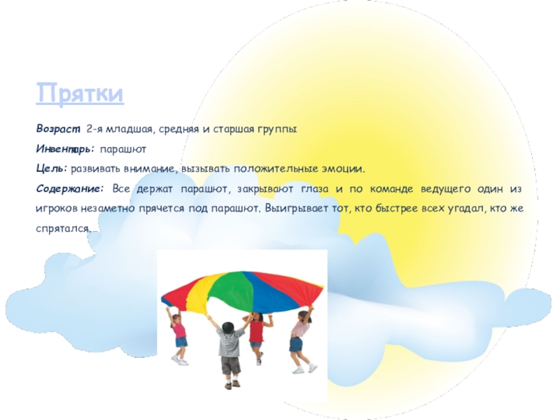Содержание: Все держат парашют, закрывают глаза и по команде ведущего один из игроков незаметно прячется под парашют. Выигрывает тот, кто быстрее всех угадал, кто же спрятался.