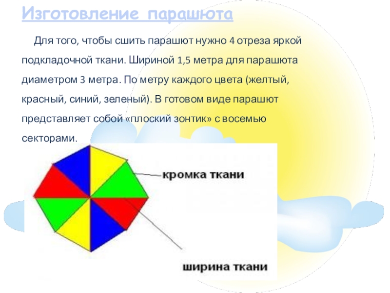 4 отреза яркой подкладочной ткани. Шириной 1,5 метра для парашюта диаметром 3 метра. По метру каждого цвета (желтый, красный, синий, зеленый). В готовом виде парашют представляет собой «плоский зонтик» с восемью секторами.
