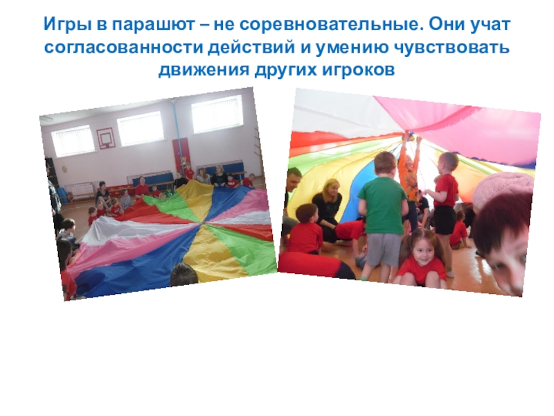 Игры в парашют – не соревновательные. Они учат согласованности действий и